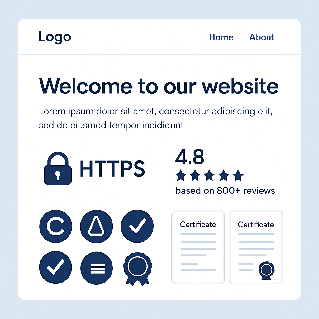 SSL certificates, testimonials, consistent branding, and fast load times all boost perceived legitimacy.